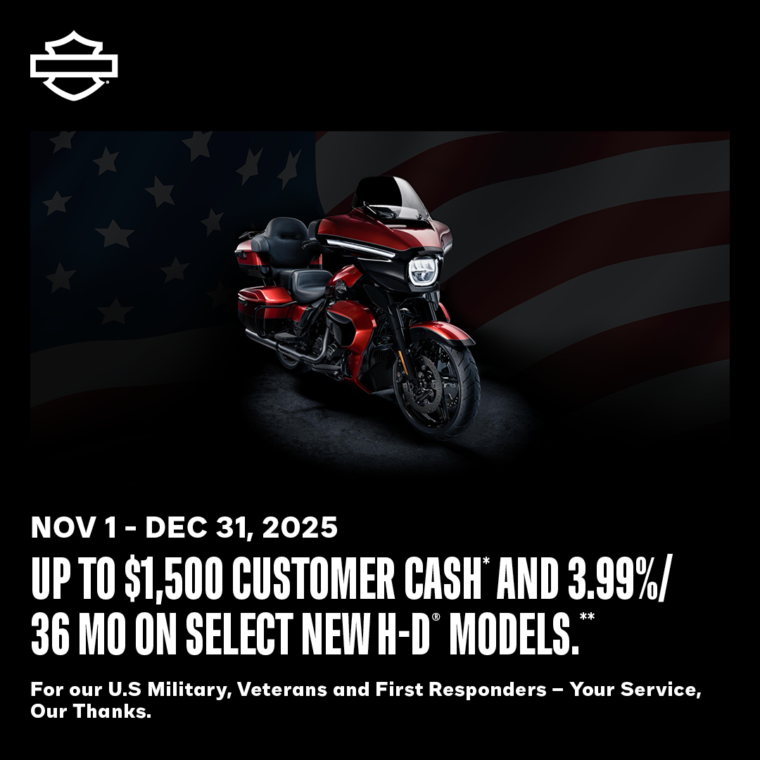 For or U.S. military, veterans and first responders - Your service, our thanks.Up to $1,500 Customer Cash* and 3.99%/36 Months on Select New H-D Models**.