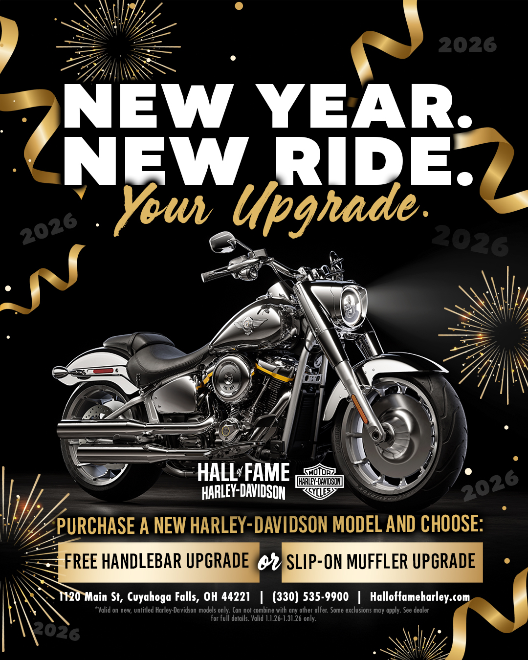 Start 2026 with a new Harley-Davidson® at Hall of Fame Harley-Davidson and make it your own. For a limited time, when you purchase a new Harley-Davidson® model, choose a free handlebar upgrade or a slip-on muffler upgrade.