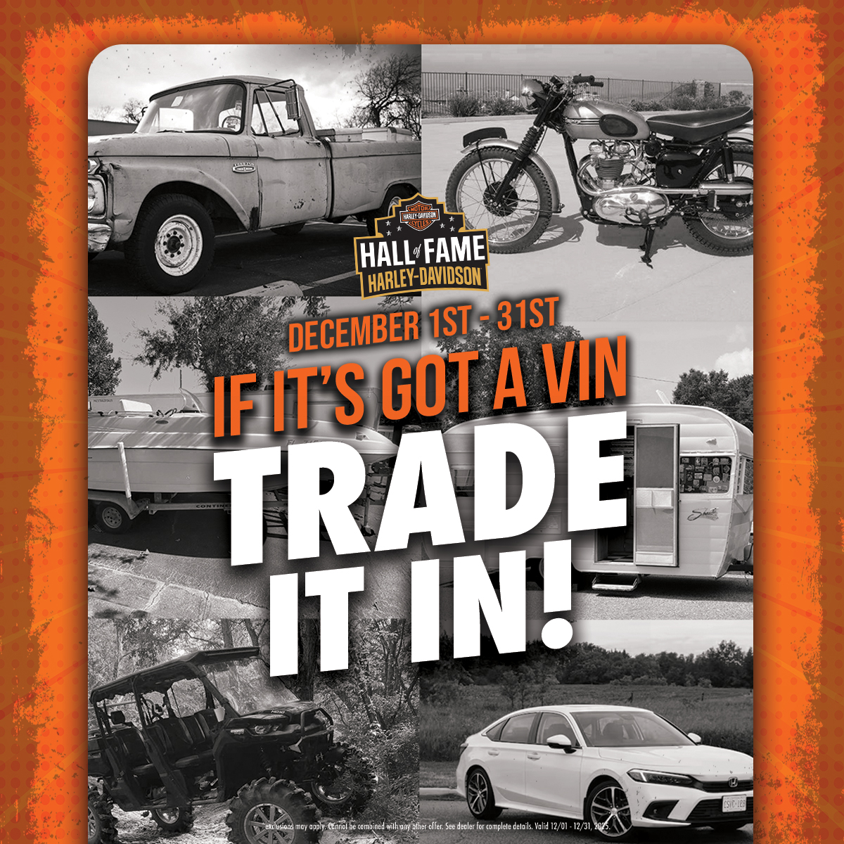 Truck, bike, boat, camper—if it’s got a VIN, we’ll take it on trade. Now’s the perfect time to turn what you’ve got into the ride you want.*Exclusions may apply. Cannot be combined with any other offer. See dealer for complete details. Valid 11.1-30.2025