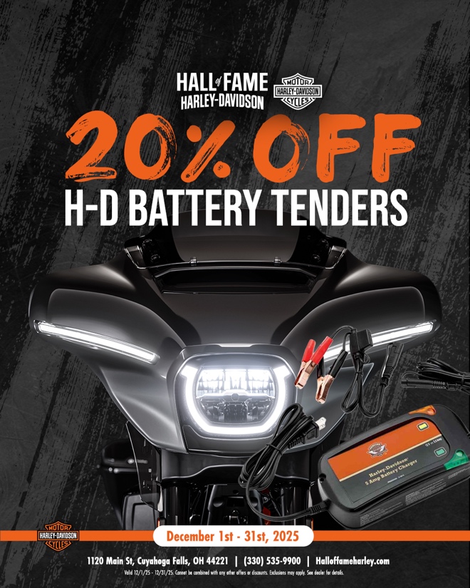 Cold temps won’t stop your ride. Keep your battery charged and ready all winter long with 20% off H-D Battery Tenders—now through the end of the month.