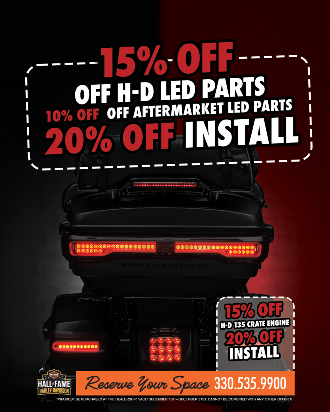 Light up the road with confidence. Enjoy 15% off H-D LED parts, 10% off aftermarket LED parts, and 20% off install—limited time only. Book your upgrade today.*Parts must be purchased and installed at participating dealership to recieve discount. Some exclusions may apply. In-stock items only. See dealer for details. Offer valid 11.1-30.25
